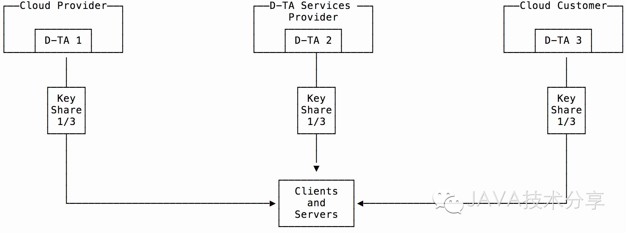 In practice, a Distributed Trust Authority (D-TA) framework would split the functions of a pairing-based key generation server into three services, each D-TA issuing thirds of private keys to distinct identities. The shares of the three cryptographic keys, as an example, could be generated by cloud computing providers, their customers, and dedicated trust providers. In this way, trust distribution can be more aligned to the participants with stakes in protecting the framework vs. the implicit trust model in use today with monolithic trust authorities such as PKI. Anyone actor can become a Distributed Trust Authority.