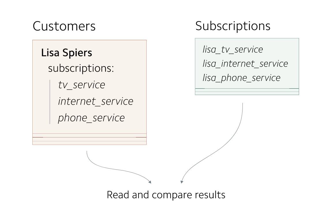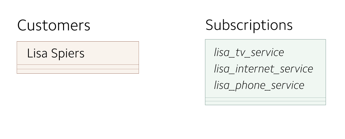 在早期,每个 Customer 对象最多只有一个 subscription 。 customers 信息存储为单独的记录。因为 customers到 subscriptions 之间的映射关系非常简单,所以subscriptions 信息与 customers 信息存储在一起。