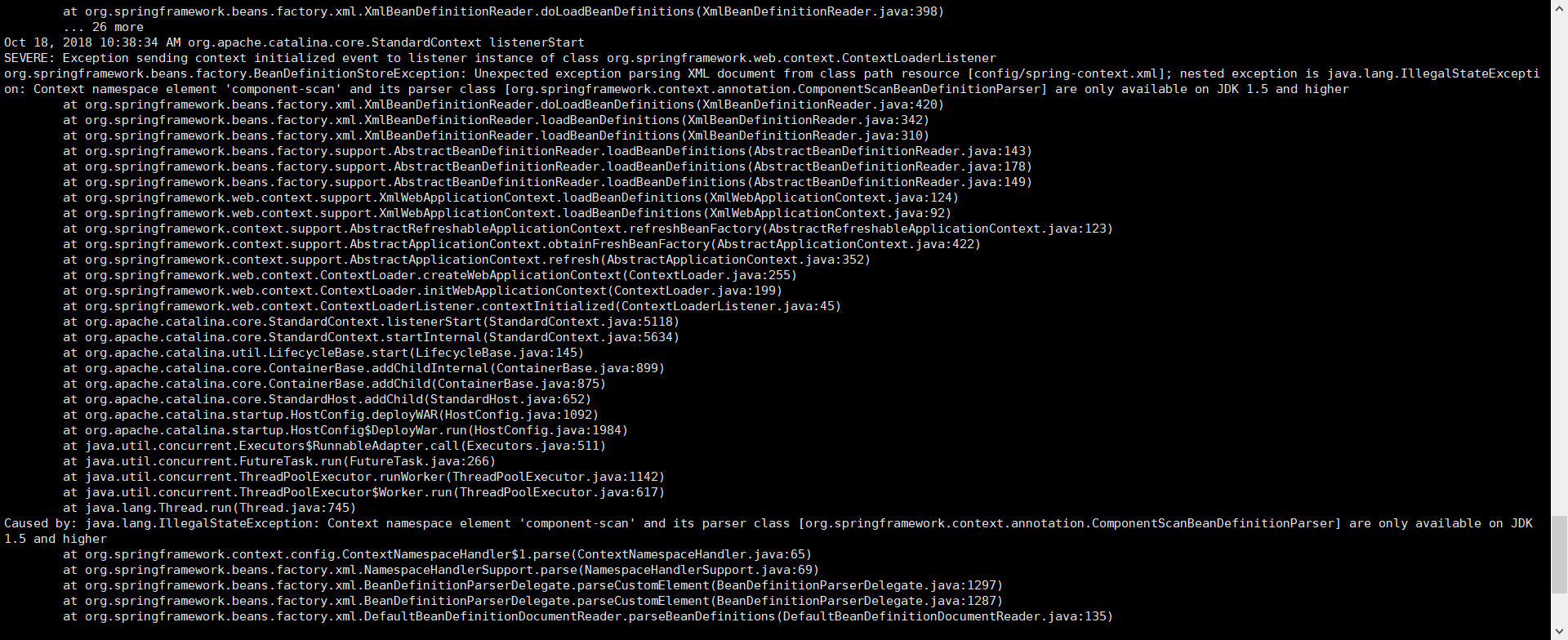 Context namespace element 'component-scan' and its parser class [org.springframework.context.annotation.ComponentScanBeanDefinitionParser] are only available on JDK 1.5 and higher