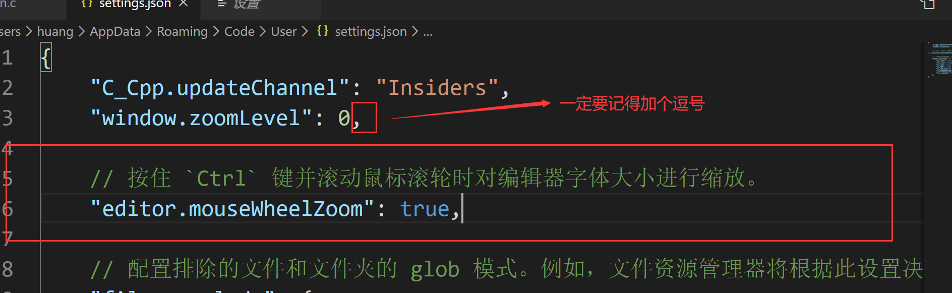 3、将"editor.mouseWheelZoom": false中的false改为true