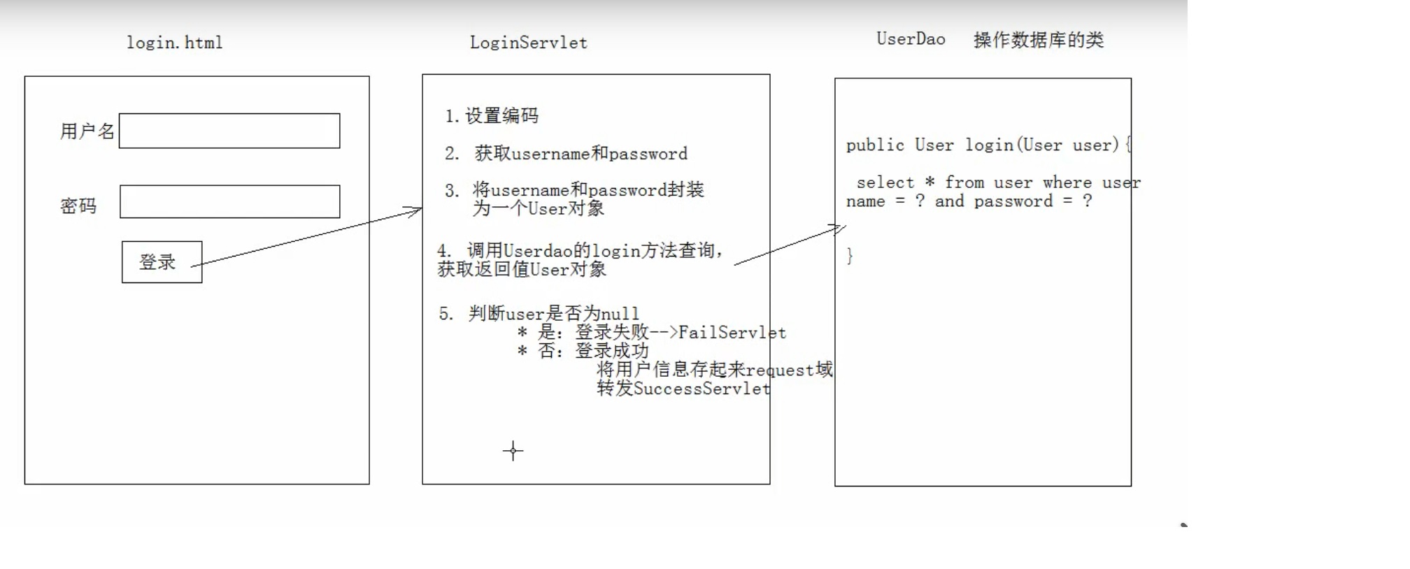 - 登录失败跳转到FailServlet展示:登陆失败!用户名或密码错误