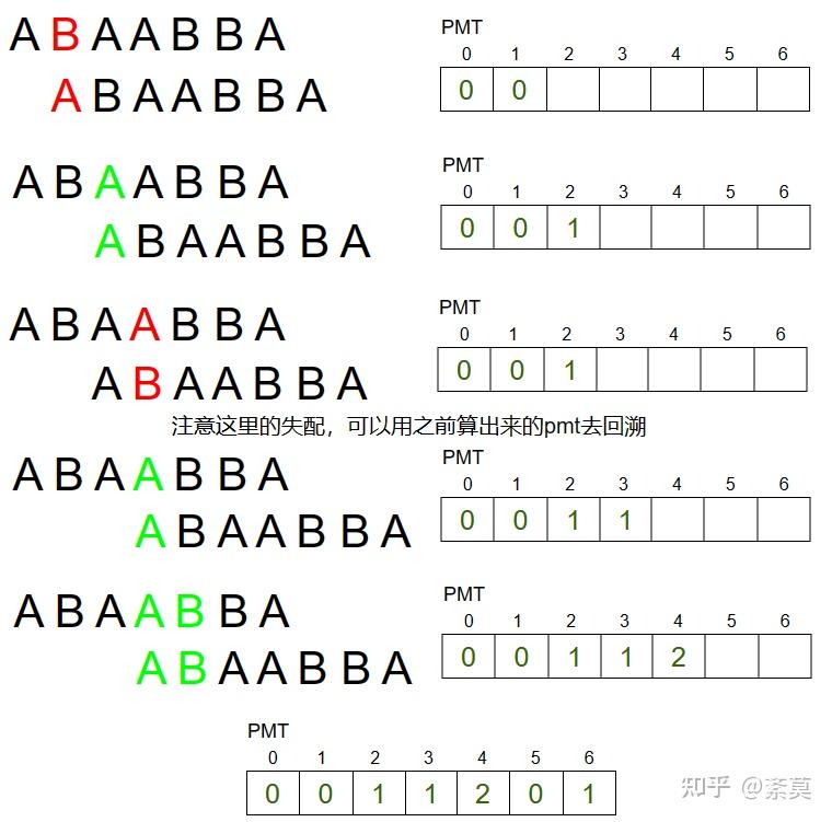 设 i 表示文本串的位置,j 表示模式串的位置,我们让 i 不动,j 回溯到最合适的位置,这个位置,我们记为PMT(Partial Match Table,部分匹配表)。