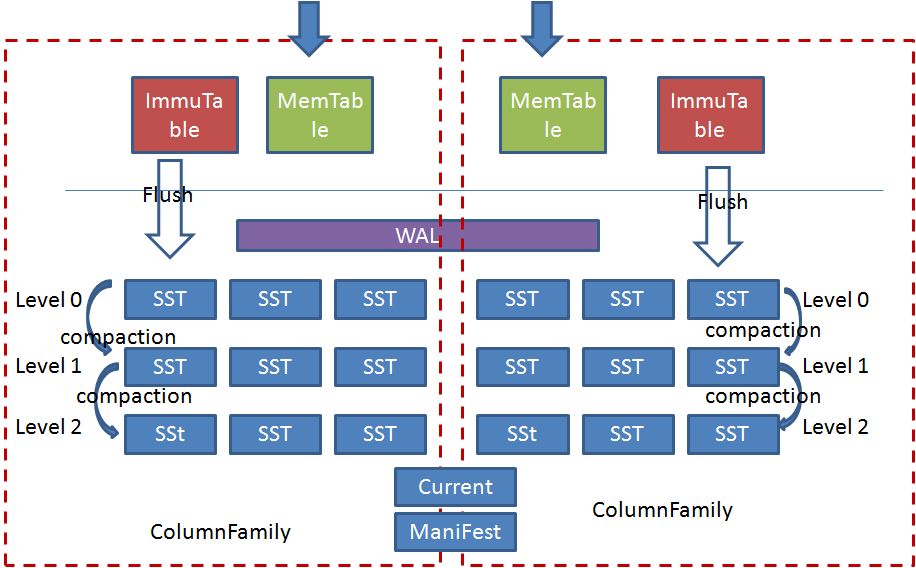 - 每个ColumnFamily有自己的Memtable, SST文件,所有ColumnFamily共享WAL、Current、Manifest文件。