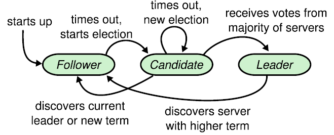 - 如果收到majority的造成票(含自己的一票)则切换到leader状态;