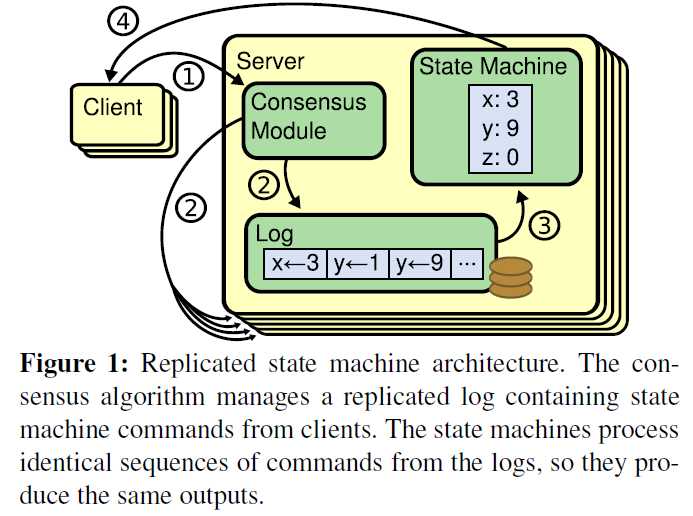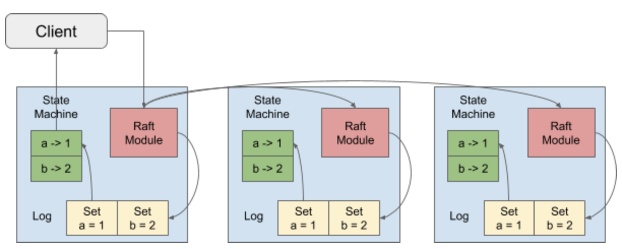 共识算法一般是通过复制状态机来实现的,复制状态机简单来说就是:相同的初识状态 + 相同的输入=相同的结束状态。 如何保证所有节点按照相同的顺序执行相同的输入,replicated log可以实现,log具有持久化、有序的特点,是大多数分布式系统的基石。因此,在raft算法中,leader将客户端请求封装到一个个log entry,然后将这些log entries复制到所有follower节点,然后大家按相同顺序应用log entry中的command,来保证状态一致性。