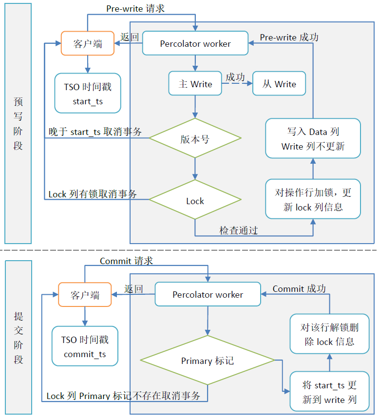 Percolator事务分为两个阶段:预写(Pre-write)和提交(Commit),本质上相当于一个加强的2PC。