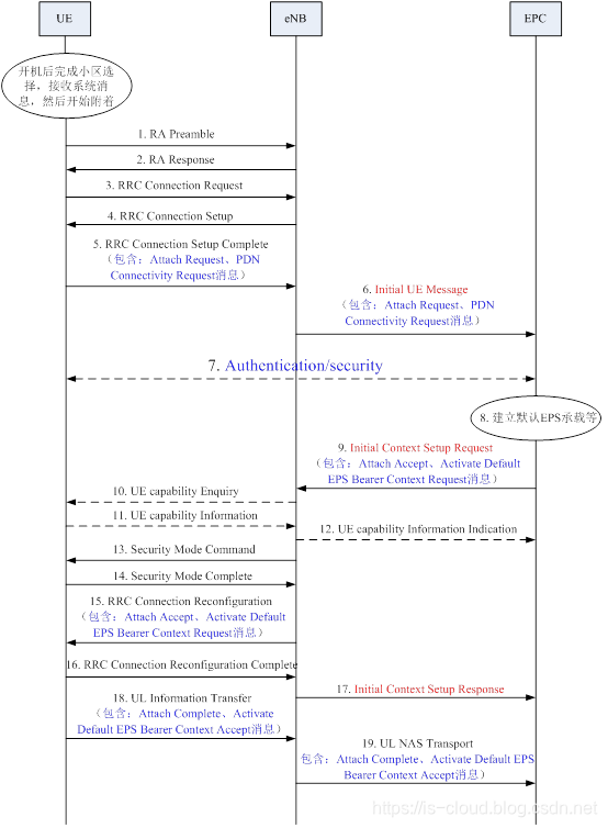 - MME 接受 Attach,UE 附着完成。MME 通过 eNB 将 APN、GUTI、PDN 地址、TAI 列表等信息反馈给 UE,并请求 UE 建立无线承载(RB);UE 完成无线承载建立后向 MME 返回一个完成消息指明 Attach 完成。