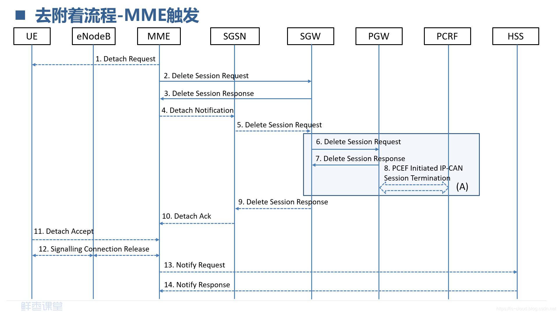 - 如果 MME 中有激活(Activate)的默认承载上下文(比如之前连接尝试失败时已经创建了承载),那么 MME 会发送消息到各个 P-GW 来删除这些无效的承载上下文。