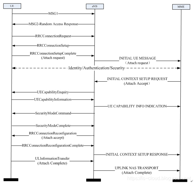 UE 完成 SRB1 承载和无线资源配置,向 eNB 发送 RRC Connection Setup Complete 消息,包含了 NAS 层 Attach Request 消息;