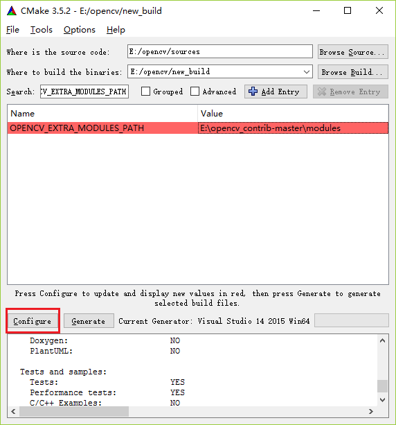 将额外的opencv_contrib加到工程中进行第二次编译,在配置表中找到“OPENCV_EXTRA_MODULES_PATH”,