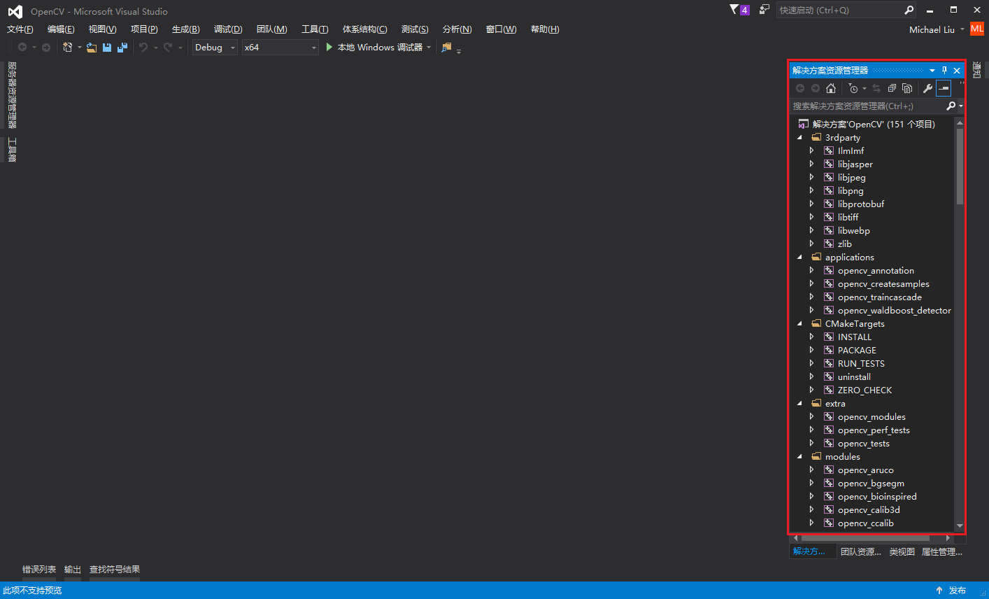 - 用VS 打开OpenCV.sln工程,在解决方案中可以查看工程目录: