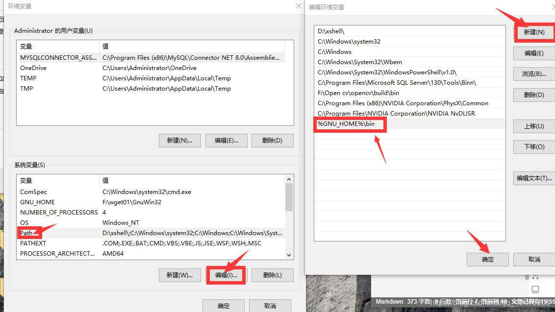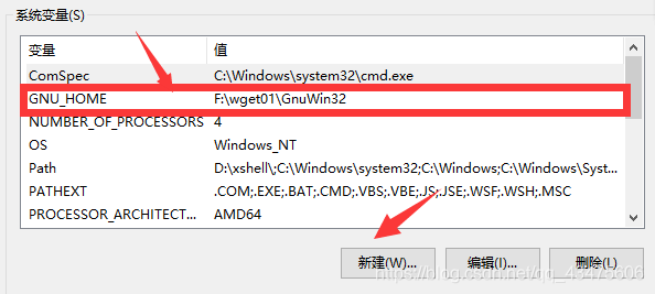 - 电脑-属性-高级系统设置-环境变量-系统变量-新建-(变量名:GUN_HOME变量值:安装wget的路径(复制粘贴即可))