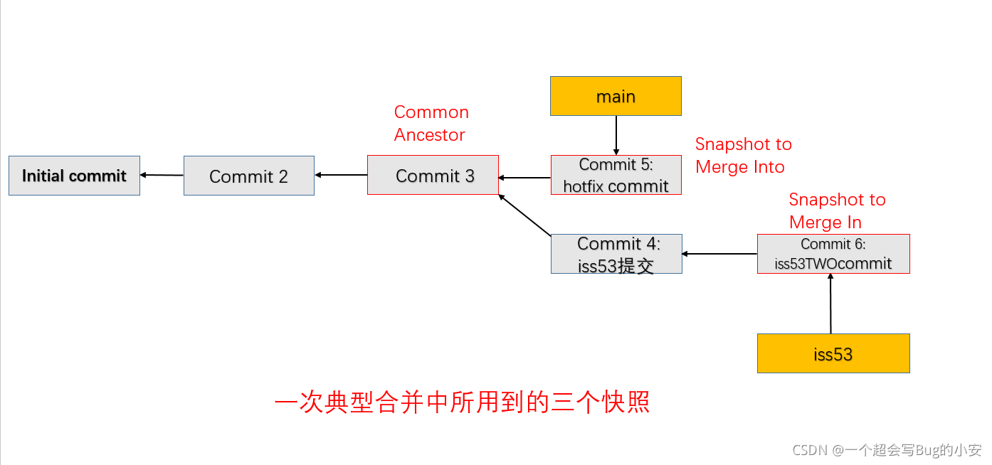 这和你之前合并 hotfix 分支的时候看起来有一点不一样。 在这种情况下,你的开发历史从一个更早的地方开始分叉开来(diverged)。 因为,main 分支所在提交并不是 iss53 分支所在提交的直接祖先,Git 不得不做一些额外的工作。 出现这种情况的时候,Git 会使用两个分支的末端所指的快照(C5 和 C6)以及这两个分支的公共祖先(C3),做一个简单的三方合并。