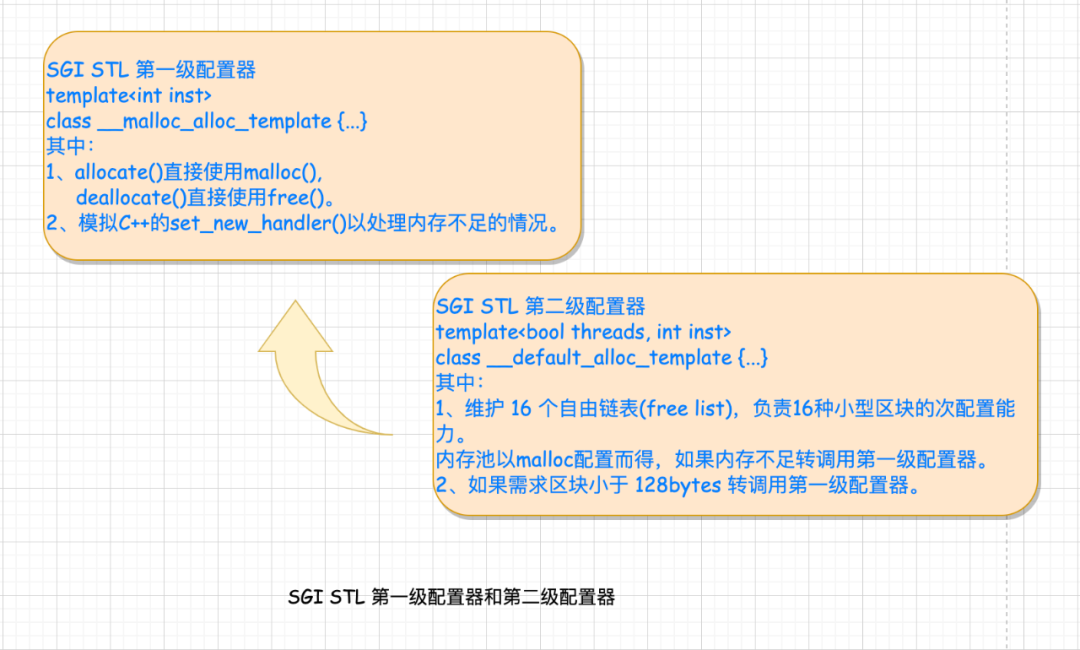 前面也说过了,SGI STL 的第一级配置器是直接使用 malloc(), free(), realloc() 并配合类似 C++ new-handler 机制实现的。第二级配置器的工作机制要根据区块的大小是否大于 128bytes 来采取不同的策略: