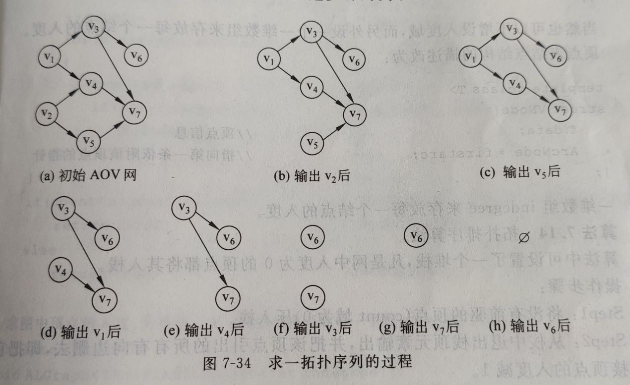 (1)从AOV网中选择一个没有前驱的顶点(该顶点入度为0)并且输出它。