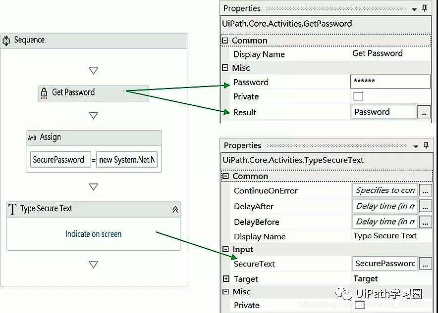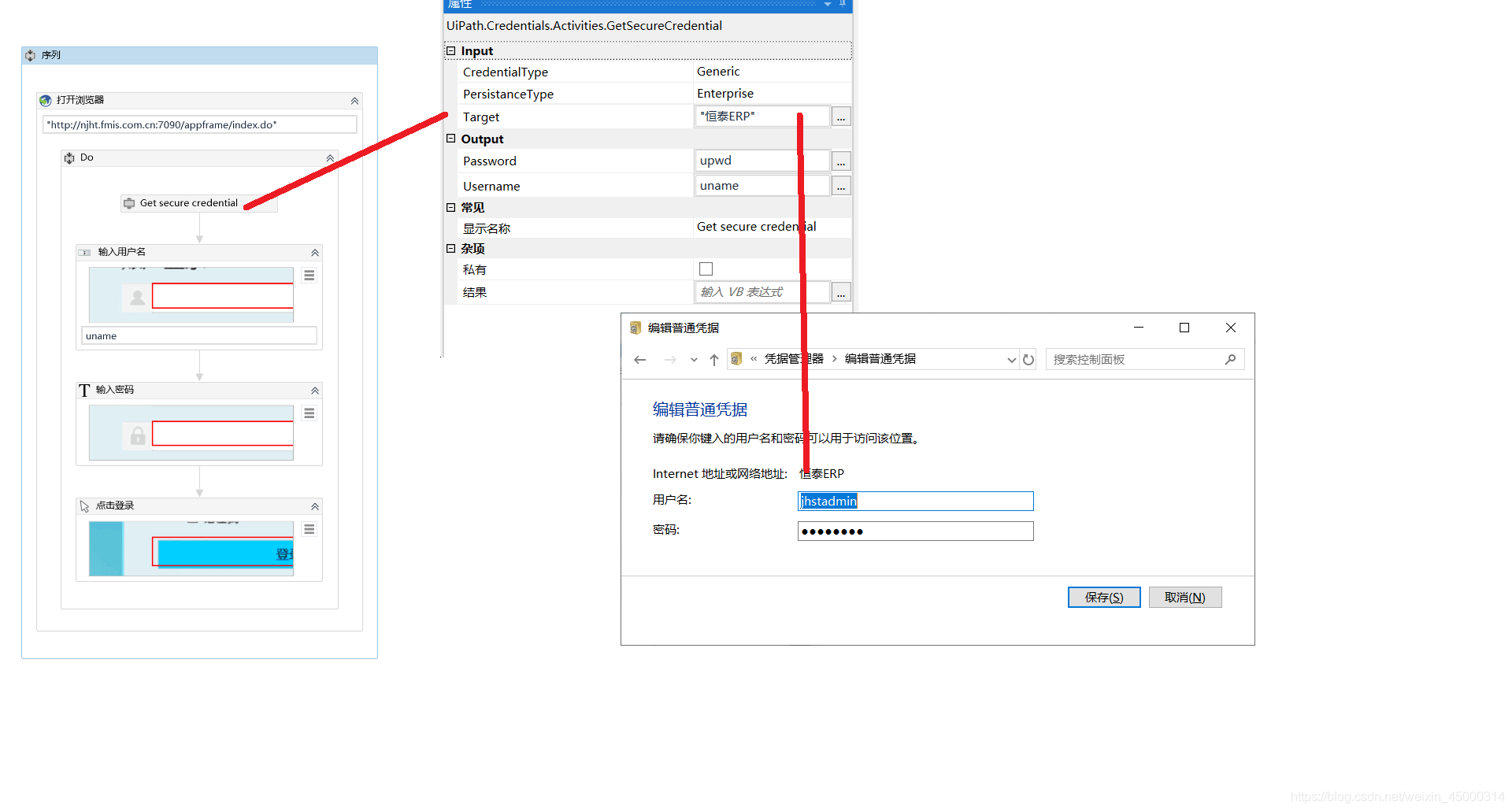 使用Activity “Get secure credential”可以调用设置好的凭证,Target与刚才的命名相对应。Output产生两个变量供后续程序使用。