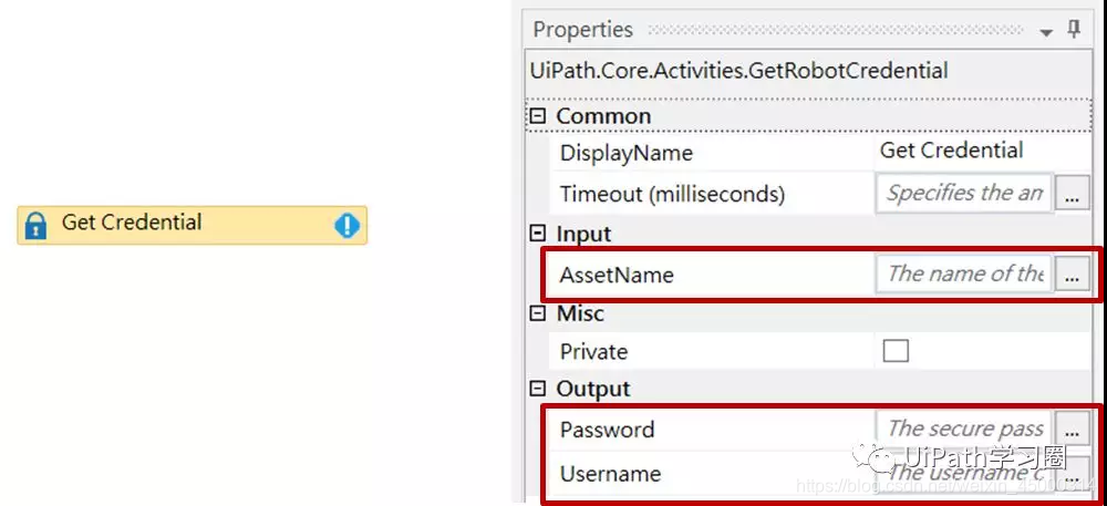 UiPath Studio中调用Asset时,使用Get Credential,因目前大家用到的很少,暂时不详细展开了。