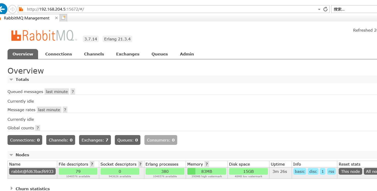 看到如上信息说明我们的rabbitmq镜像已经启动成功了,我们试着在本机浏览器上访问ip+port,这里的ip是rabbitmq所运行的ip地址,port为15672