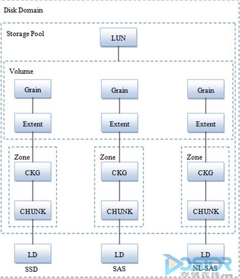 至于Extent,这个一个可变的值。也就是用户要在上面创建LUN,映射给某个主机。主机不同的应用可能有不同的要求,如ORACLE,这个块可以小些,如对视频数据,这个块可以大些。我们以后说的分层存储都是基于这个粒度,系统会检查每个Extent的I/O情况,然后把热数据迁移到SSD上,提升性能。