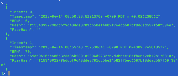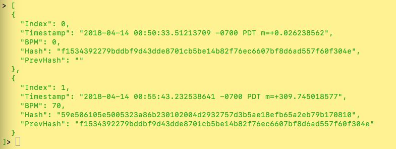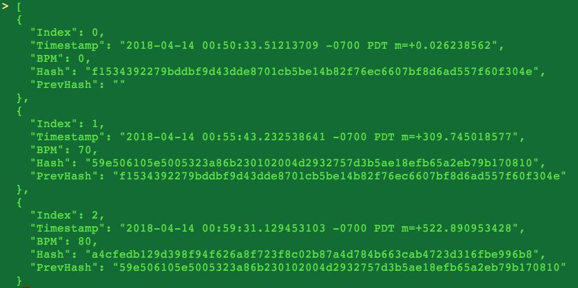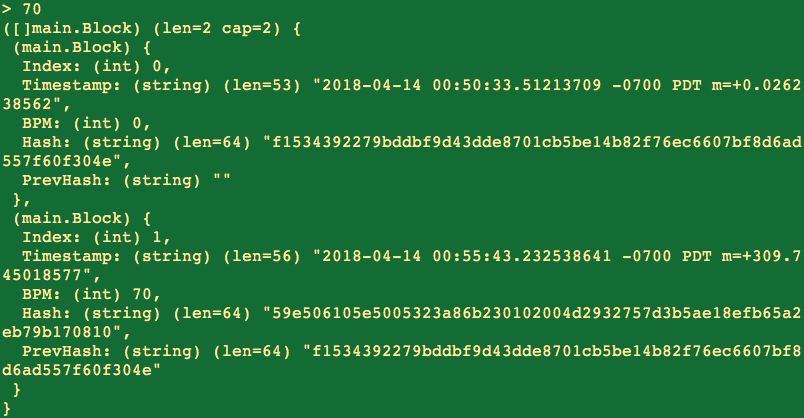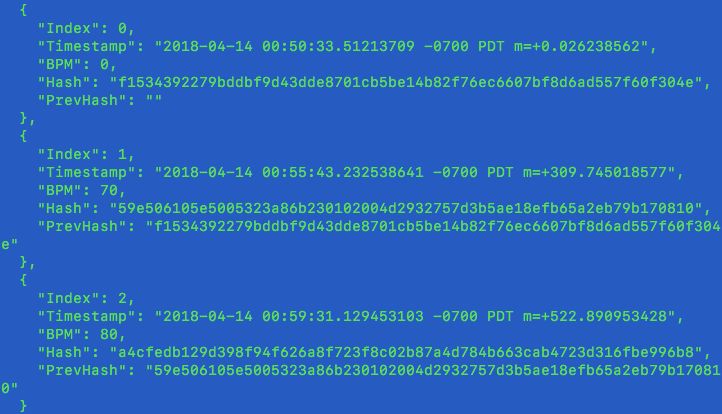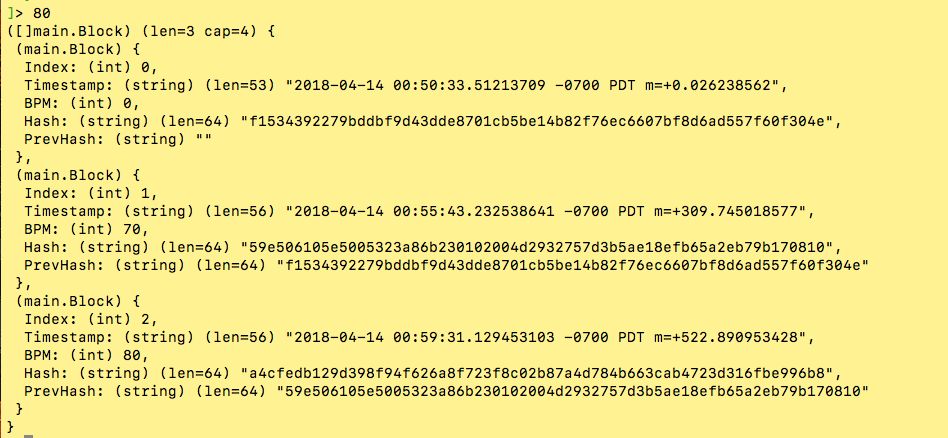 // make sure block is valid by checking index, and comparing the hash of the previous blockfunc isBlockValid(newBlock, oldBlock Block) bool {if oldBlock.Index+1 != newBlock.Index {return false}if oldBlock.Hash != newBlock.PrevHash {return false}if calculateHash(newBlock) != newBlock.Hash {return false}return true}// SHA256 hashingfunc calculateHash(block Block) string {record := strconv.Itoa(block.Index) + block.Timestamp + strconv.Itoa(block.BPM) + block.PrevHashh := sha256.New()h.Write([]byte(record))hashed := h.Sum(nil)return hex.EncodeToString(hashed)}// create a new block using previous block's hashfunc generateBlock(oldBlock Block, BPM int) Block {var newBlock Blockt := time.Now()newBlock.Index = oldBlock.Index + 1newBlock.Timestamp = t.String()newBlock.BPM = BPMnewBlock.PrevHash = oldBlock.HashnewBlock.Hash = calculateHash(newBlock)return newBlock}