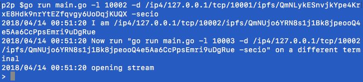 接着打开第三个终端窗口,运行: go run main.go-l10002-d<given addressinthe instructions>-secio
