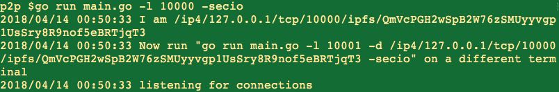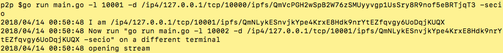 回到你的工作目录 examples/p2p,打开第一个终端窗口,输入 go run main.go-l10000-secio