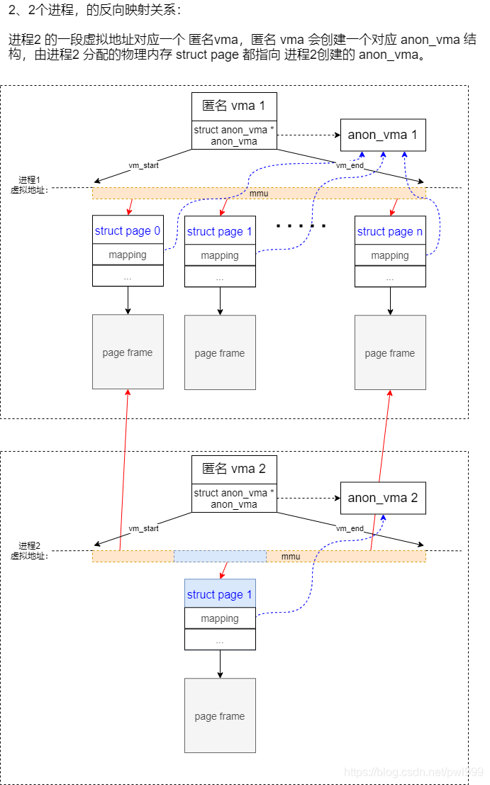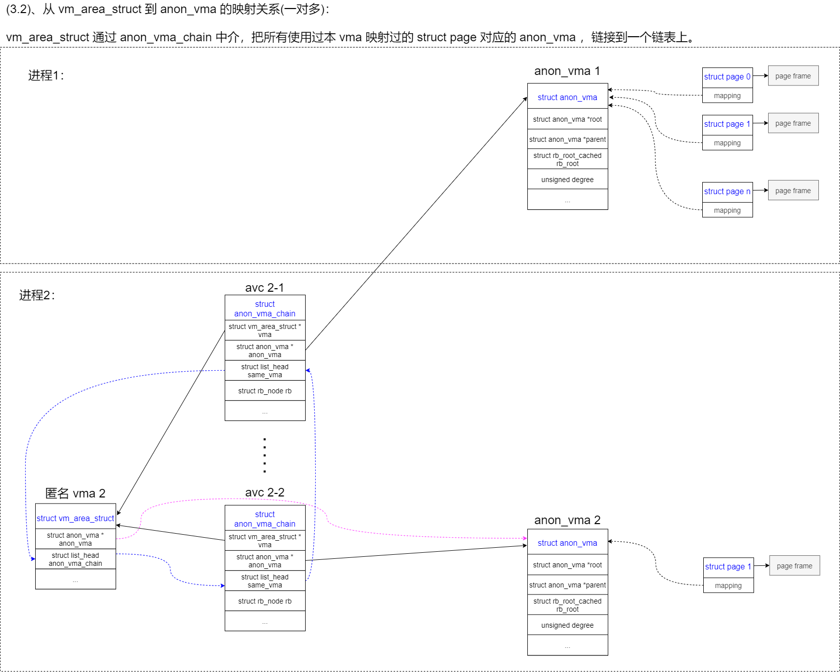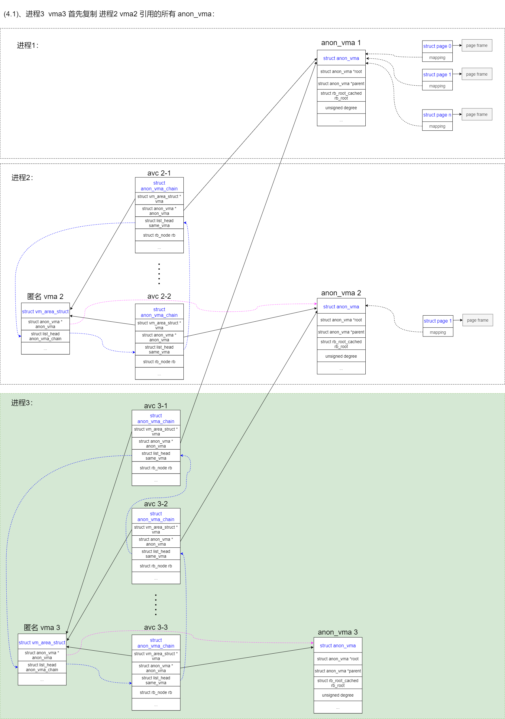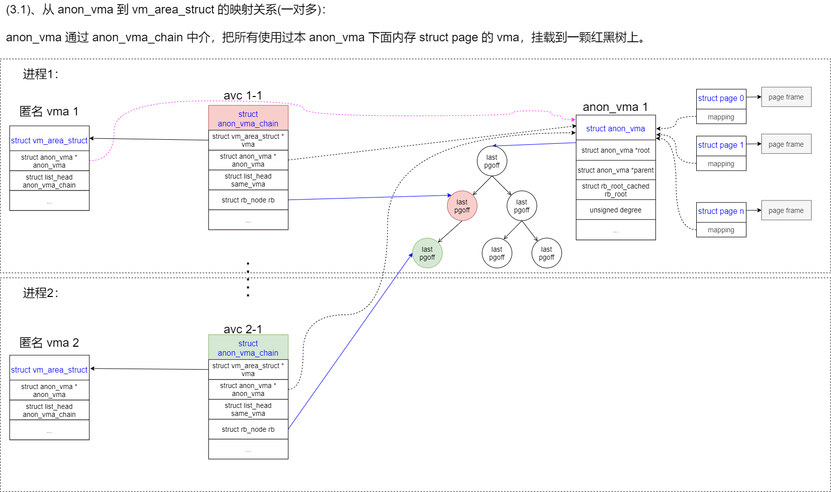 - (1) 本进程分配的物理内存 struct page 只会指向本进程 vma 对应的的 anon_vam。例如 进程1分配的物理内存 page 0-n 指向 anon_vma 1,进程2 分配的物理内存 struct page 1指向 anon_vma 2。