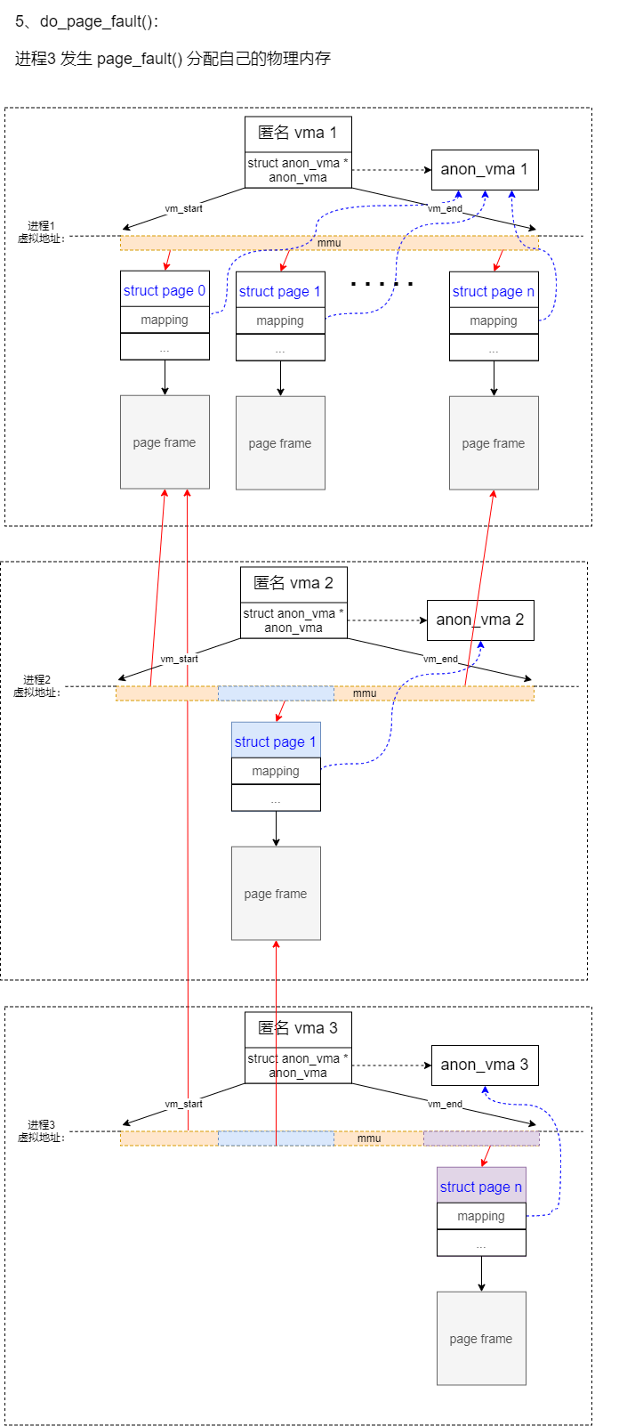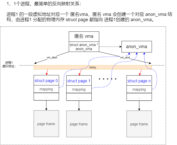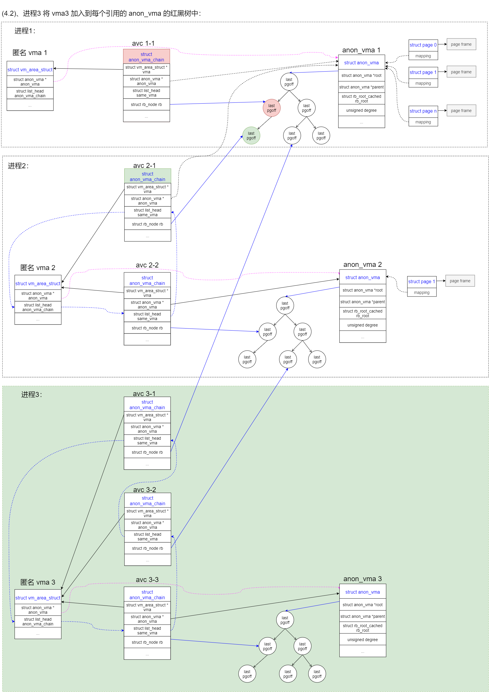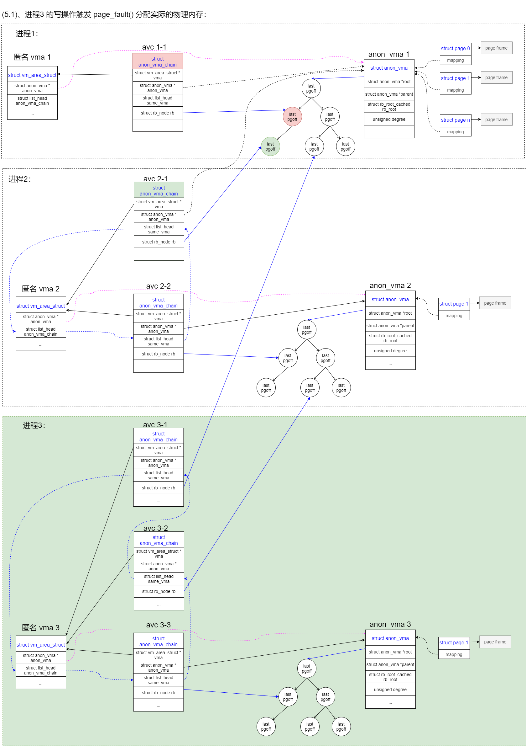 - (1) 本进程分配的物理内存 struct page 只会指向本进程 vma 对应的的 anon_vam。例如 进程1分配的物理内存 page 0-n 指向 anon_vma 1,进程2 分配的物理内存 struct page 1指向 anon_vma 2。