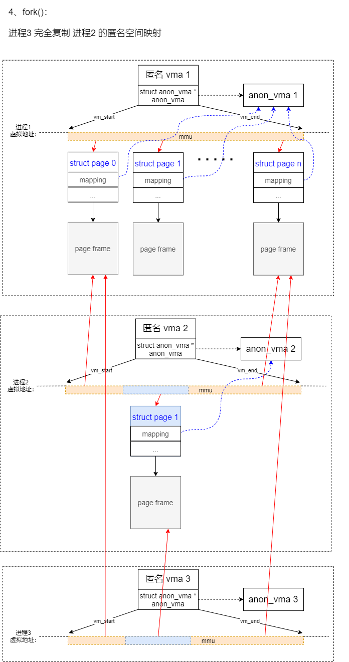 如果进程2 fork() 创建了一个 进程3,开始的时候 进程3 完全复制 进程2 “匿名 vma2” 的映射:
