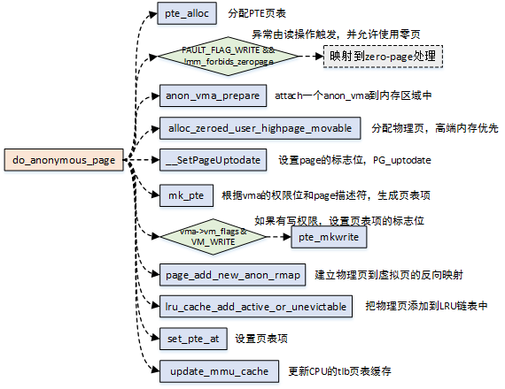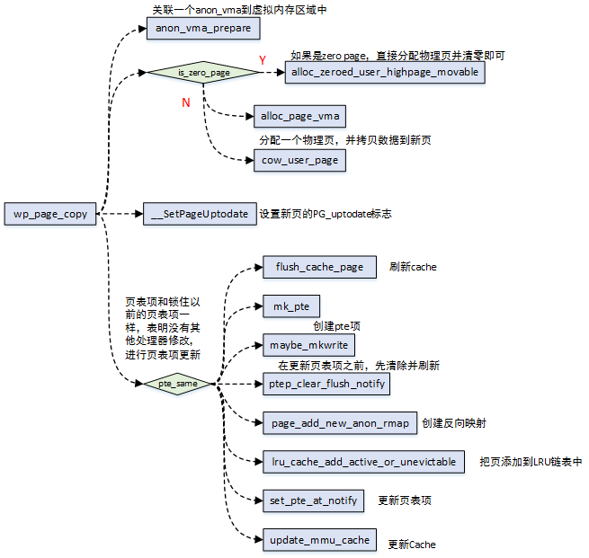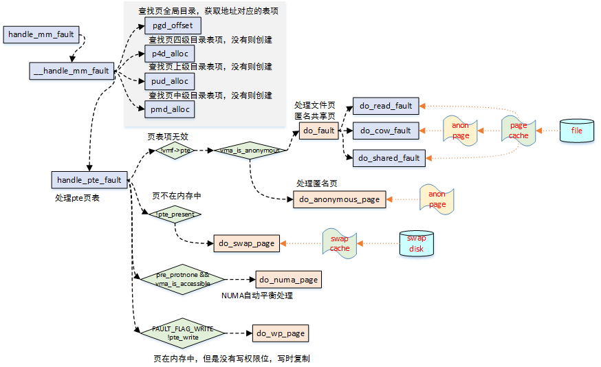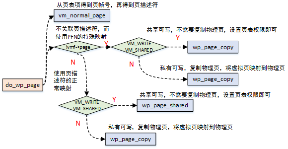 pgd→p4d→pud→pmd→pte的所有条目,如果对应的地址是私有可写的 (MAP_PRIVATE + VM_MAYWRITE) ,那么这段地址就是 COW(Copy On Write),在复制映射关系时需要把对应的父子进程 PTE 设置为 只读,这样任何的写操作都会触发 do_page_fault() 来分配新的内存 page :