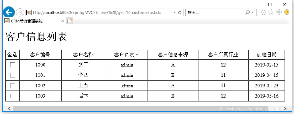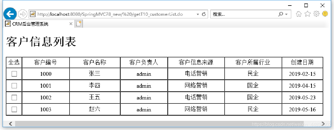 客户信息列表中,客户信息来源和客户所属行业这两列显示的内容是英文或者数字。在实际开发中,这种情况需要将英文或者数字转码成中文,便于数据的分析。