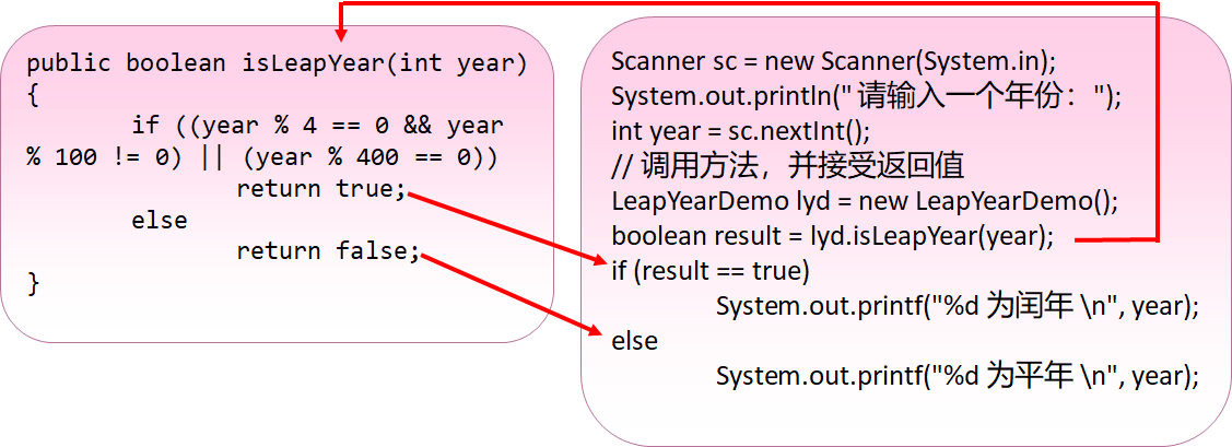 示例:编写程序,在控制台输入一个年份,判断该年份是否为闰年并输出结果。要求定义方法实现闰年的判断,并返回判断结果。