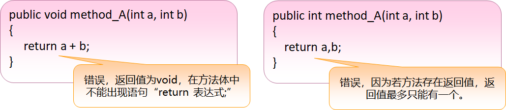 - 方法可以没有返回值,也可以存在返回值,但最多只能存在一个返回值。