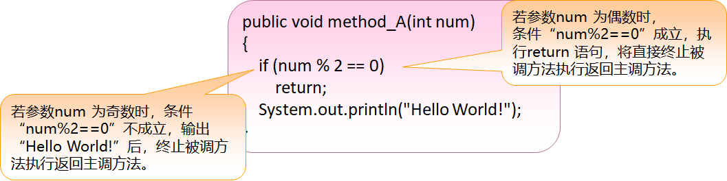 (3)在无返回值方法中,方法体内可以没有return 语句,当被调方法执行完毕后,将自动返回至主调方法。也可以使用“return;”语句,结束被调方法的执行,返回主调方法。