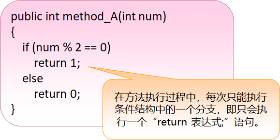 (4)在有返回值方法中,方法体中必须包含“return 表达式;”语句。