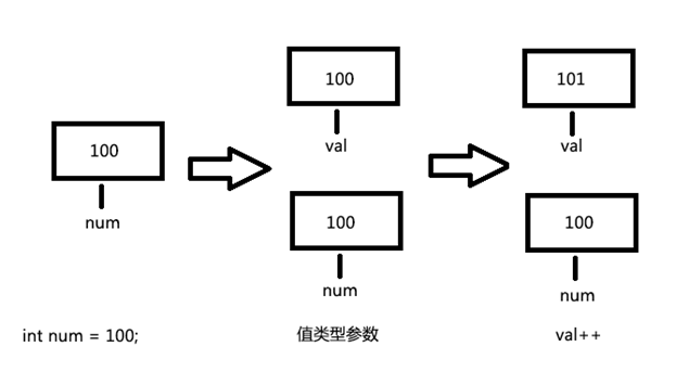 当方法的参数是值类型时,因为值类型变量里存放的即变量的值,形参和实参会完成变量值的拷贝。当方法内代码完成形参值的改变时,实参不会同步改变