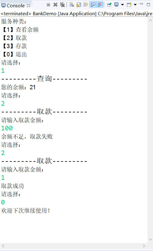 示例:模拟银行账户存取款以及查看余额功能。要求:将各种业务功能模块分别定义方法实现。