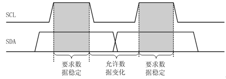IIC中数据的传输是通过SDA和SCL进行高低电平变化来完成的,在传送数据时,只有当时钟线SCL为高电平的时候数据线SDA上的电平才有效(即SDA高电平代表1;SDA低电平代表0),所以在SCL为高电平的时候SDA上的数据一定要保持稳定才行,不然数据的传输会很不稳定的。那就是说SCL为低电平的时候SDA怎么变化都没有关系,但SCL为高电平时SDA一定要稳定,可以理解为传输信号的改变是在SCL为低电平的时候进行的(SCL高电平时SDA的改变即为传输信号的改变)。