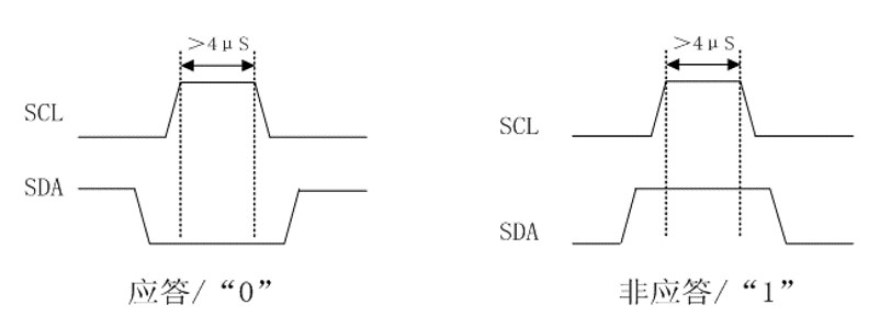 IIC总线协议规定:每传输1字节数据(含地址及命令)后,都要有一个应答信号,以确定数据传送是否被对方收到。应答信号由接收方产生,应答信号的格式为:在SCL为高电平时SDA为低电平(被动的,我们到时候只要检测一下SDA是否被拉低即可),表示数据传输正确,产生应答。但当主机为接收方时,对最后一字节不应答。