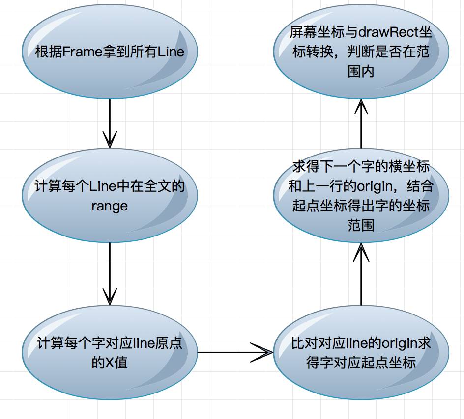 接受到字符的frame,还是判断点击位置是否在frame中,如果在,则响应点击事件并结束方法。如果没有不在任何一个字符的frame内,则说明没有点击到文字,执行相应的点击事件。