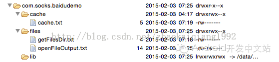 02-03 07:18:04.068 22237-22237/? D/TAG﹕ file1=/data/data/com.socks.baidudemo/files/getFilesDir.txt |