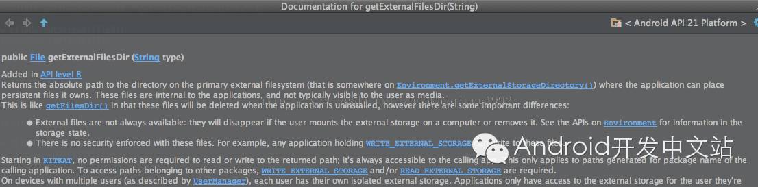 这个方法不是Context的方法,而是Environment的两个方法,第一个方法获取到的其实是外部存储的根目录,而第二个方法获取到得则是外部存储的公共目录。其实在访问权限上是没有区别的,不同点是getExternalStoragePublicDirectory()在运行的时候,会需要你带有一个特定的参数来指定这些public的文件类型,以便于与其他public文件进行分类。参数类型包括DIRECTORY_MUSIC 或者 DIRECTORY_PICTURES. 如下: