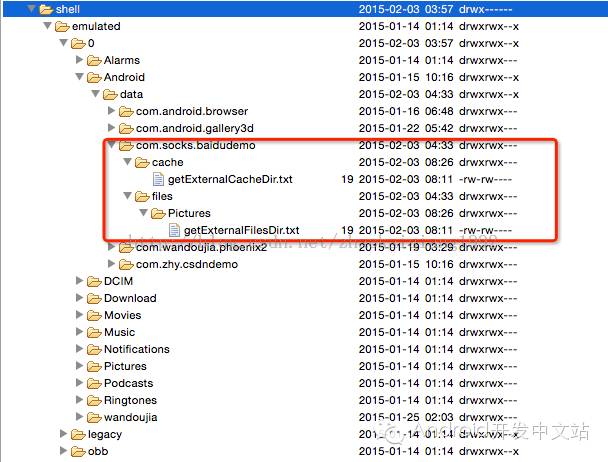 02-03 08:11:38.860 9096-9096/? D/TAG﹕ file3=/storage/emulated/0/Android/data/com.socks.baidudemo/cache/getExternalCacheDir.txt02-03 08:11:38.860 9096-9096/? D/TAG﹕ file4=/storage/emulated/0/Android/data/com.socks.baidudemo/files/Pictures/getExternalFilesDir.txt |