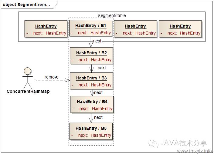 下面的示意图描述了如何删除一个已经存在的元素的。假设我们要删除B3元素。首先定位到B3所在的Segment,然后再定位到Segment的table中的B1元素,也就是Bx所在的链表。然后遍历链表找到B3,找到之后就从头结点B1开始构建新的节点B1(蓝色)加到B4的前面,继续B1后面的节点B2构造B2(蓝色),加到由蓝色的B1和B4构成的新的链表。继续下去,直到遇到B3后终止,这样就构造出来一个新的链表B2(蓝色)->B1(蓝色)->B4->B5,然后将此链表的头结点B2(蓝色)设置到Segment的table中。这样就完成了元素B3的删除操作。需要说明的是,尽管就的链表仍然存在(B1->B2->B3->B4->B5),但是由于没有引用指向此链表,所以此链表中无引用的(B1->B2->B3)最终会被GC回收掉。这样做的一个好处是,如果某个读操作在删除时已经定位到了旧的链表上,那么此操作仍然将能读到数据,只不过读取到的是旧数据而已,这在多线程里面是没有问题的。