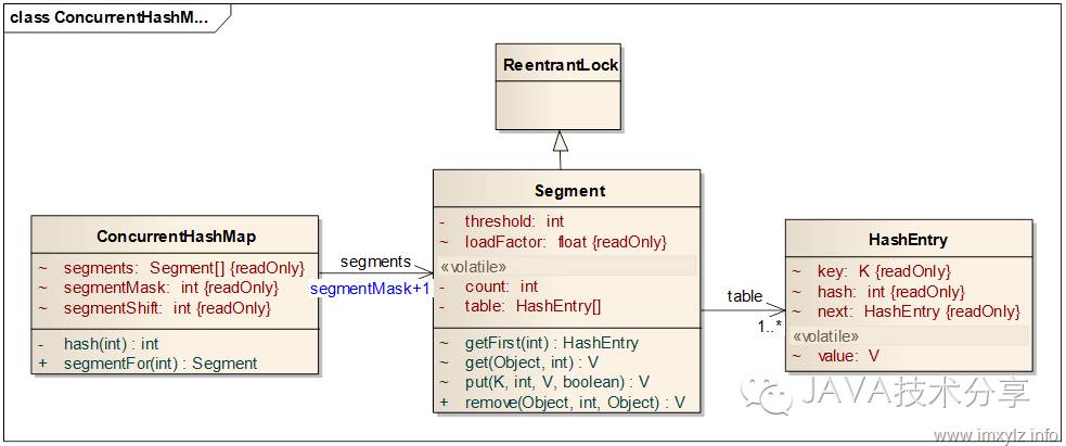上图就是ConcurrentHashMap的类图。参考上面的说明和HashMap的原理分析,可以看到ConcurrentHashMap将整个对象列表分为segmentMask+1个片段(Segment)。其中每一个片段是一个类似于HashMap的结构,它有一个HashEntry的数组,数组的每一项又是一个链表,通过HashEntry的next引用串联起来。