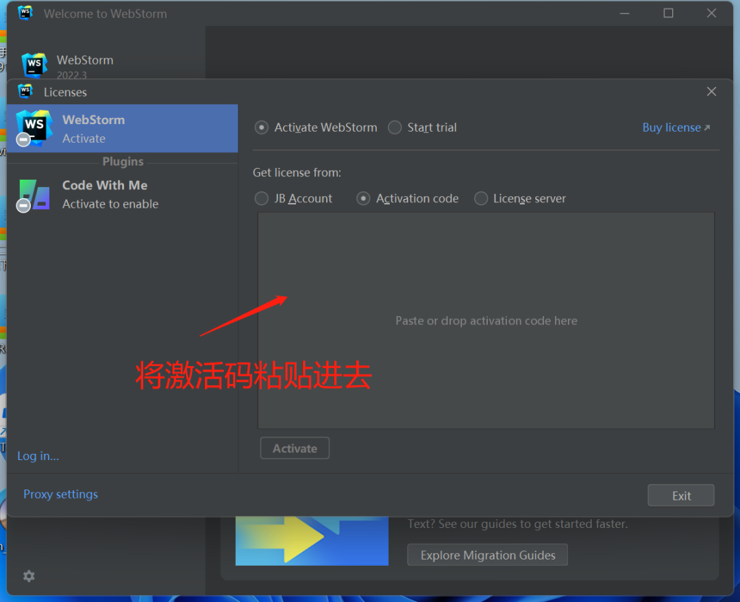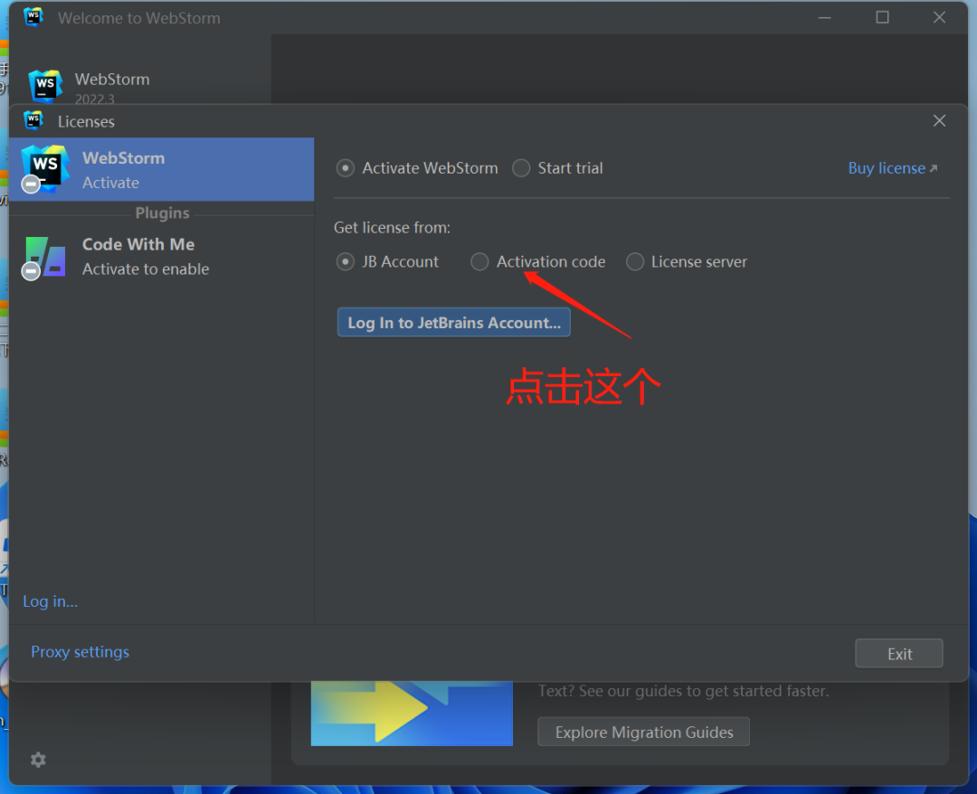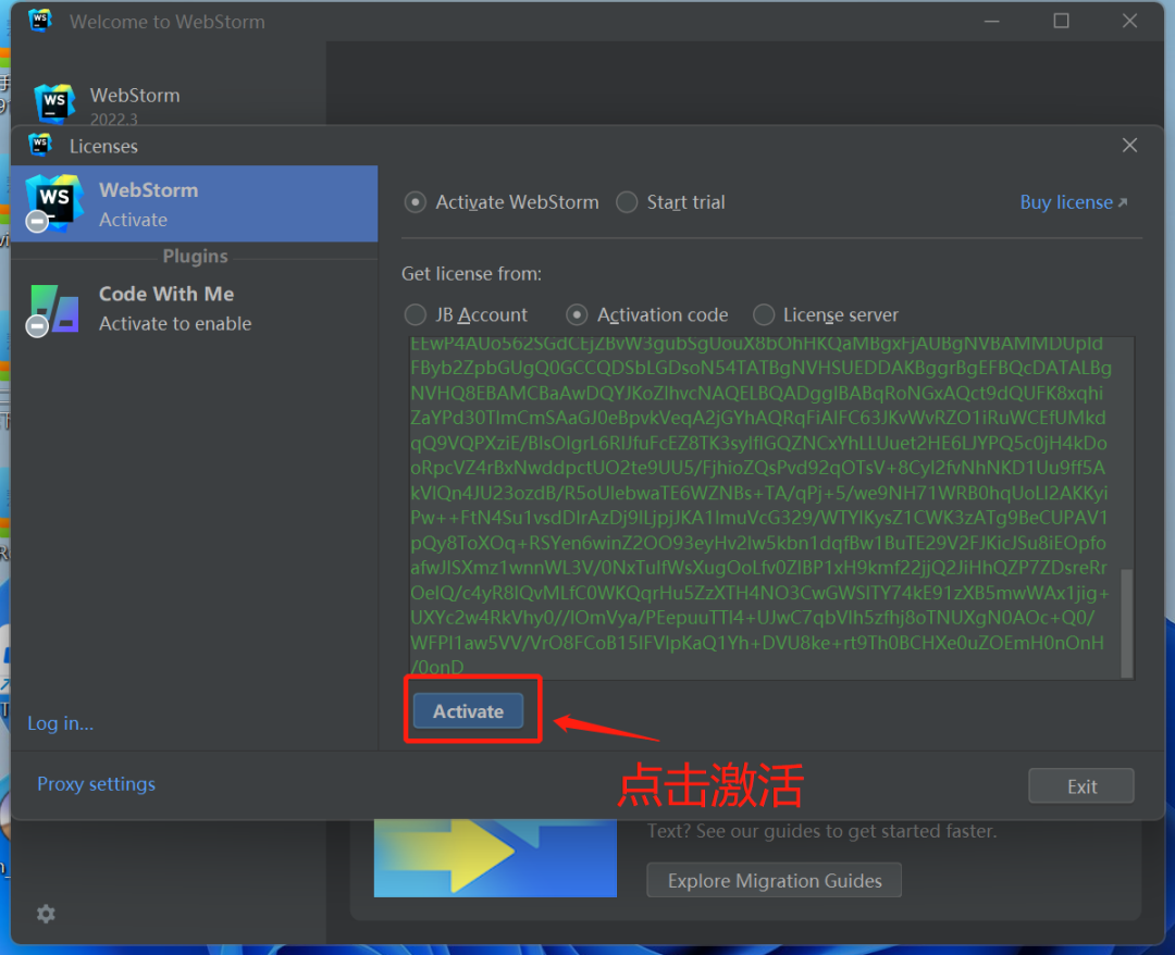 5、然后我们打开 IDEA,如下图所示点击 Activation code 。