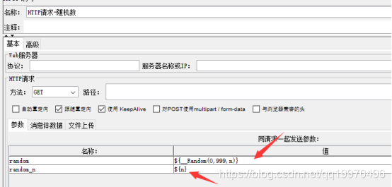 值中"${n}"中,n为变量名;“${__Random(0,999,n)}”中Random为函数名。