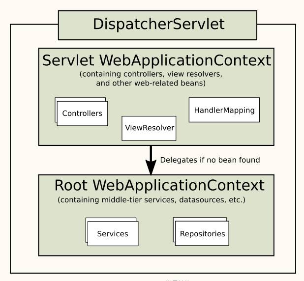 在Spring MVC中,每个DispatcherServlet都持有一个自己的上下文对象WebApplicationContext,它又继承了根(root)WebApplicationContext对象中已经定义的所有bean。这些继承的bean可以在具体的Servlet实例中被重载,在每个Servlet实例中你也可以定义其scope下的新bean。