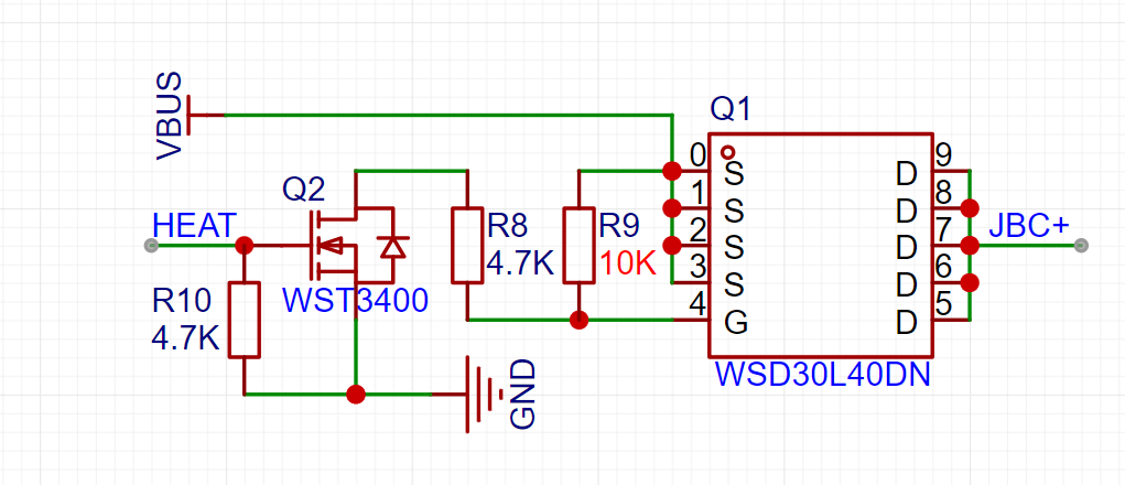 经过一颗N型MOS管放大后驱动一颗P型MOS管将VBUS(电源供电)给烙铁头供电;