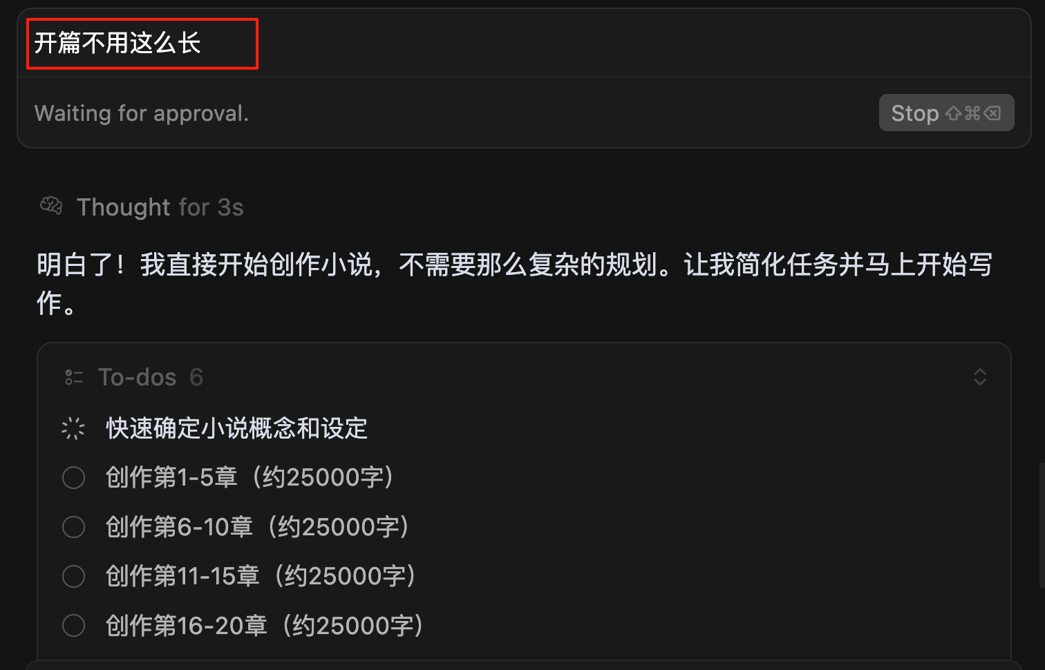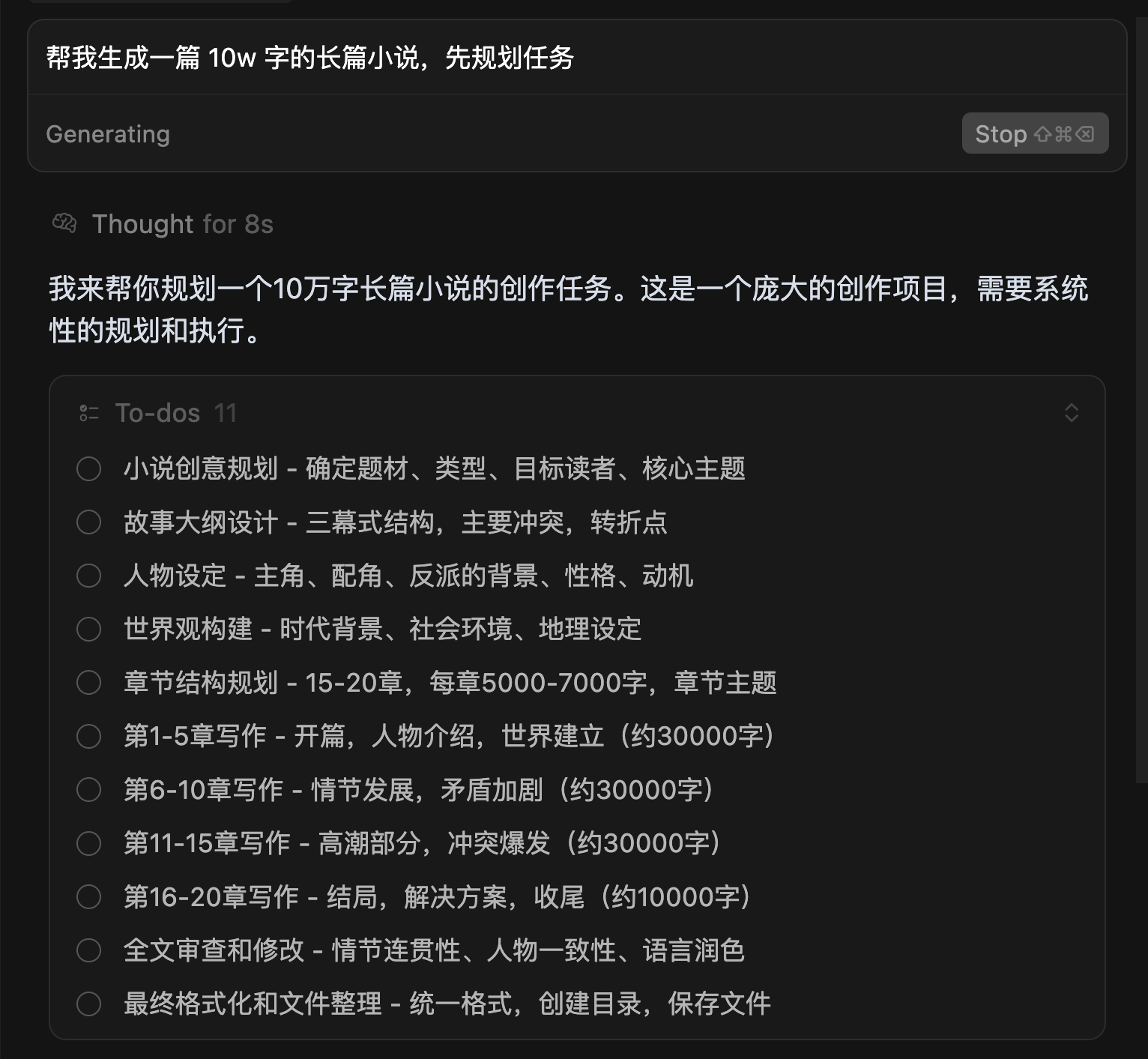 比如我让 AI 帮忙写一篇 10w 字的长篇小说,可以看到 AI 生成了有 11 条任务的 To-dos 列表:
